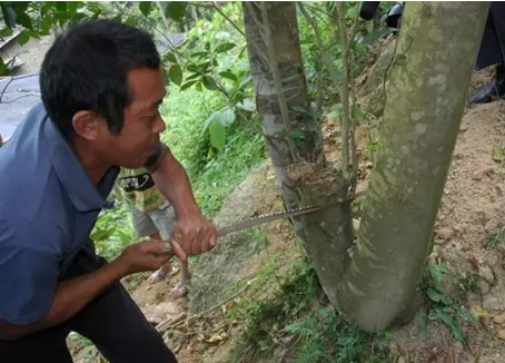 用半斷桿法促使沉香樹快速結(jié)香的方法,是在離沉香樹干基部1米以上的樹干上鋸一個(gè)傷口,傷口的深度約為沉香樹干直徑的1/3至1/2。沿著沉香樹干同一個(gè)方向的不同高度,按照以上方法再多鋸幾個(gè)傷口,傷口與傷口之間的間距約為30-40厘米左右,傷口寬度約為1厘米左右。