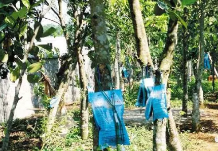 在沉香樹干的同側(cè)取逆風(fēng)方向,自上而下,大約每隔40-50厘米的地方,按垂直于樹干的方向開一列香門,傷口深度約為樹干粗的1/3左右,傷口寬約1-2厘米左右,然后用結(jié)香菌種塞滿香門,再用塑料薄膜包扎封口,防止雜菌污染和昆蟲、螞蟻為害。